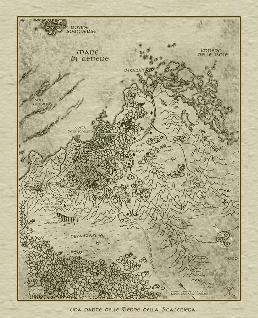 Sempre per ragioni di spazio e opportunità non c’è la parte di mondo della Scacchiera compresa nel primo libro! Sorry… dovrete accontentarvi di vedere qui le terre che attraverserete nel secondo insieme a Ryan e soci, almeno in parte. Perché una parte di quella mappa nel libro non la ‘visiterete’ anche se lì è allegramente e giustamente disegnata. Chiaro che è quella con meno dettagli. Alcuni luoghi però saranno teatro di qualche avvenimento del terzo libro… o almeno dovrebbero. Vi faccio notare che sul fondo (anche se è venuto un po’ tagliato nell’operazione di scansione) c’è il nostro eterno punto di partenza, il Tumulo delle Grotte Rosse, vicino al Campo Nuovo e che una bella freccia vi dice da che parte sia l’Altopiano delle Streghe, dimora della vecchia e ambiziosa Uri, del buon vecchio Megu e compagnia bella.